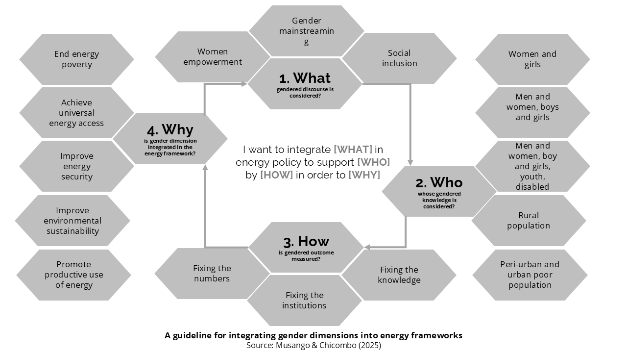 To make energy transitions truly inclusive, the study1 propose a practical guideline for policymakers, researchers, and practitioners. First, clarify which gender discourse is being addressed—women empowerment, gender mainstreaming, or social inclusion. Second, specify whose knowledge and needs are considered, ensuring that policies reflect the realities of women, men, youth, and marginalized groups. Third, develop and use clear, gender-disaggregated indicators to measure outcomes. Finally, align the purpose of gender integration with broader goals like poverty reduction and universal energy access.